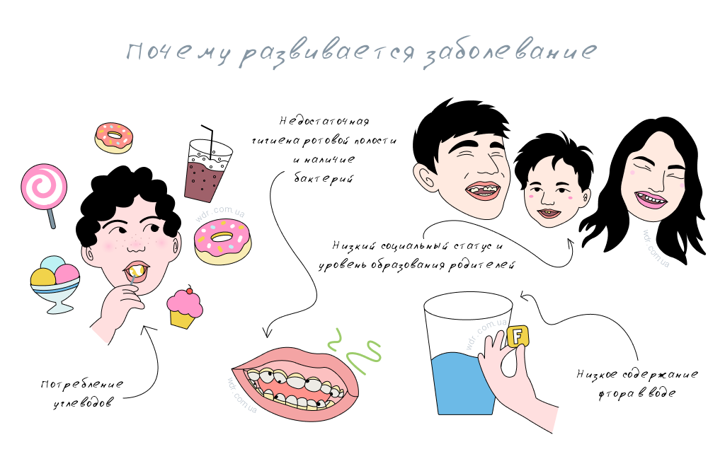 Временные зубы менее устойчивы к повреждающим факторам, чем постоянные. Непосредственной причиной кариеса молочных зубов являются бактерии. Они образуют во рту биопленки, которые появляются в условиях при недостаточной гигиены полости рта. Бактерии вырабатывают вещества, растворяющие эмаль зуба. Кроме того, кариес быстрее прогрессирует на фоне постоянных механических, химических, температурных воздействий.